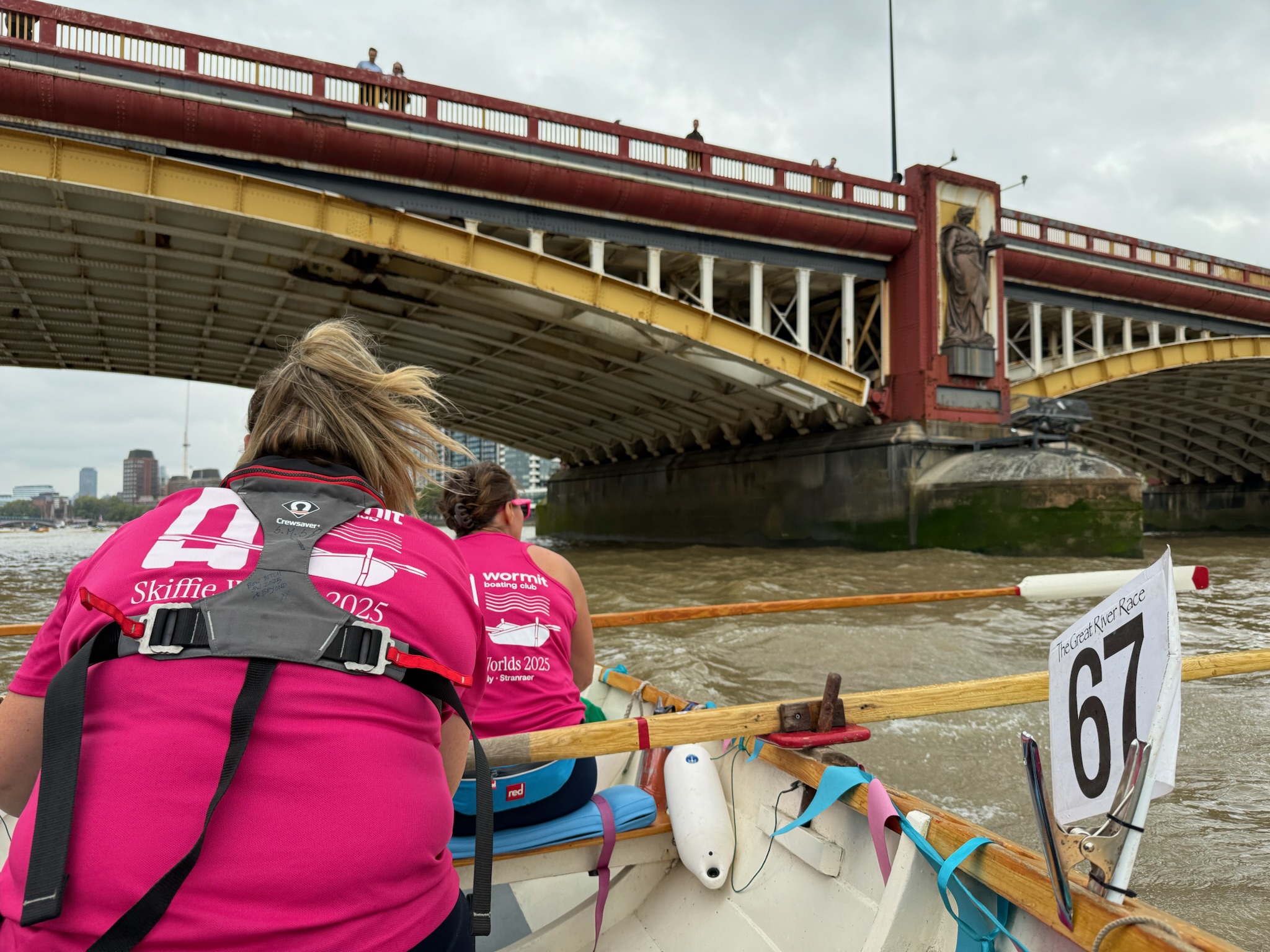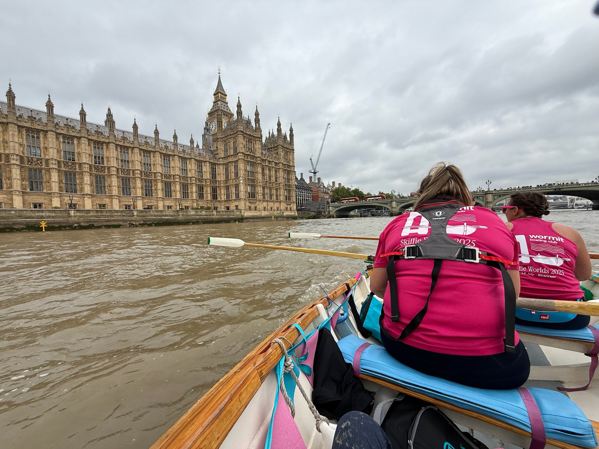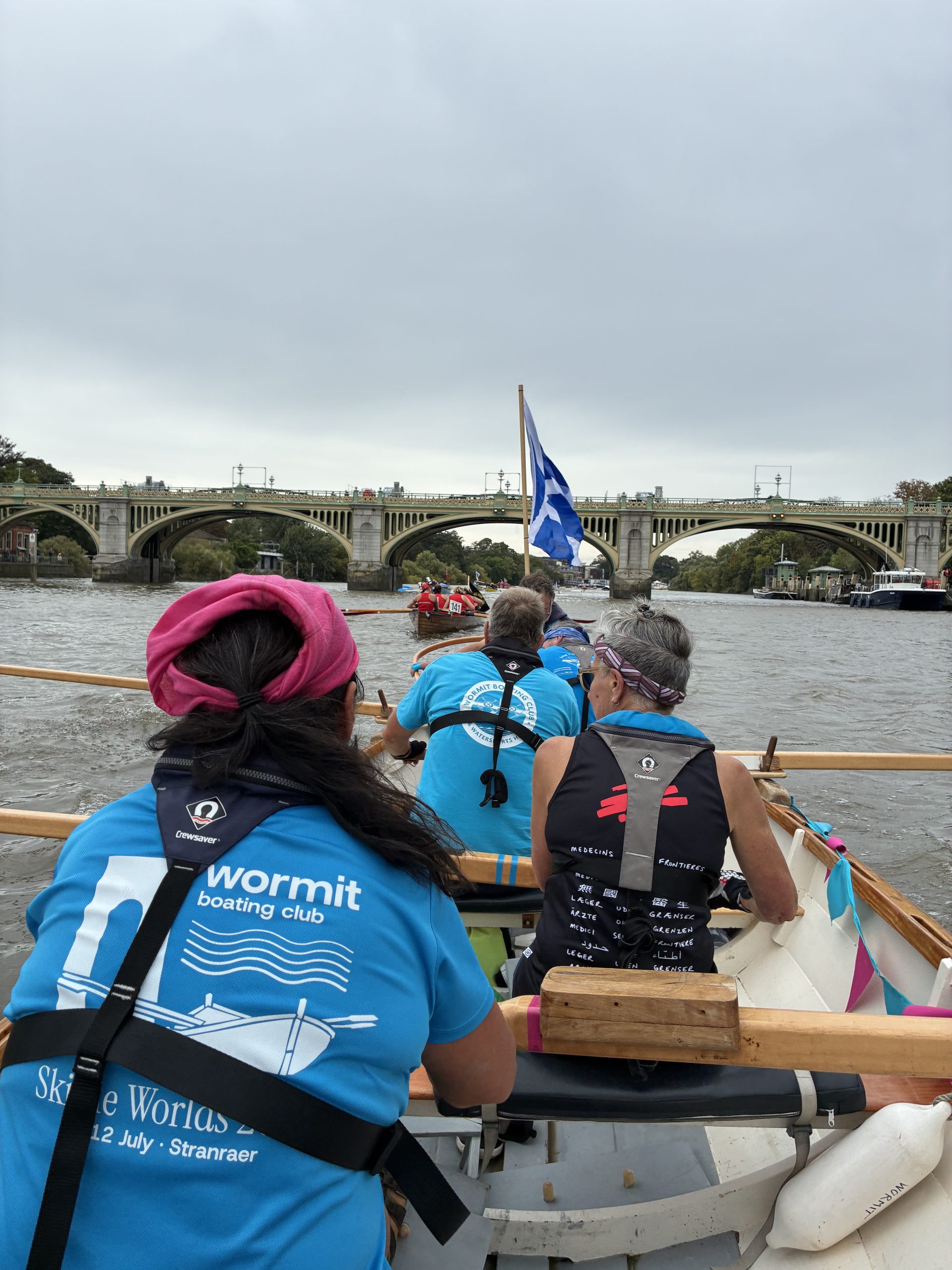 Sometimes in life, reality conspires to confound expectation as, for example, when the menu’s triple-fried artisan rosemary-seasoned potato wedges turn out to be, well, chips. For those in Wormit’s skiffs, surging at full tilt up the Thames in the midst of a vast and colourful flotilla, sinews straining and hearts pounding, sparing no quarter for those around them, for once reality plays ball.  And then some. Indeed, were it possible to access the individual inner monologues of our skiffies at this very moment, as they pass into yet another Visit London vista - whether Tower Bridge, the Palace of Westminster, the London Eye, the National Theatre or Battersea power station - the consensus view would likely be ‘Well, THIS is an absolute BLAST!’  All around is a melee of competing boats, jockeying for advantage as the next spectator-bedecked bridge approaches and the available leeway seems to diminish with alarming speed.  The gig on Flying Boat’s port beam would appear not to have read the bit in the (dauntingly comprehensive) race rules about ‘no overtaking under bridges’, and up ahead a scout-powered tub has decided to heave-to mid-channel. And all the while the marshals’ powerboats and police launches are charging about demonstrating that, in the hierarchy of the hard-to-herd, rowing boats trump cats every time.  It’s like Canaletto’s bustling Grand Canal, only turned up to eleven.  And with RIBs.  Avoiding numerous inventive-collision opportunities, both Wormit skiffs more than hold their own, Flying Boat’s crew successfully putting into practice their change-over routine with successive coxes keeping things on a mostly even keel. Eventually the tourist landmarks and high rises of central London give way to exclusive riverside apartments, water meadows and the kind of bucolic scenery to warm the heart of Jerome K. Jerome. Or Toad.