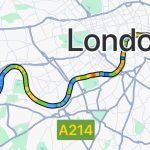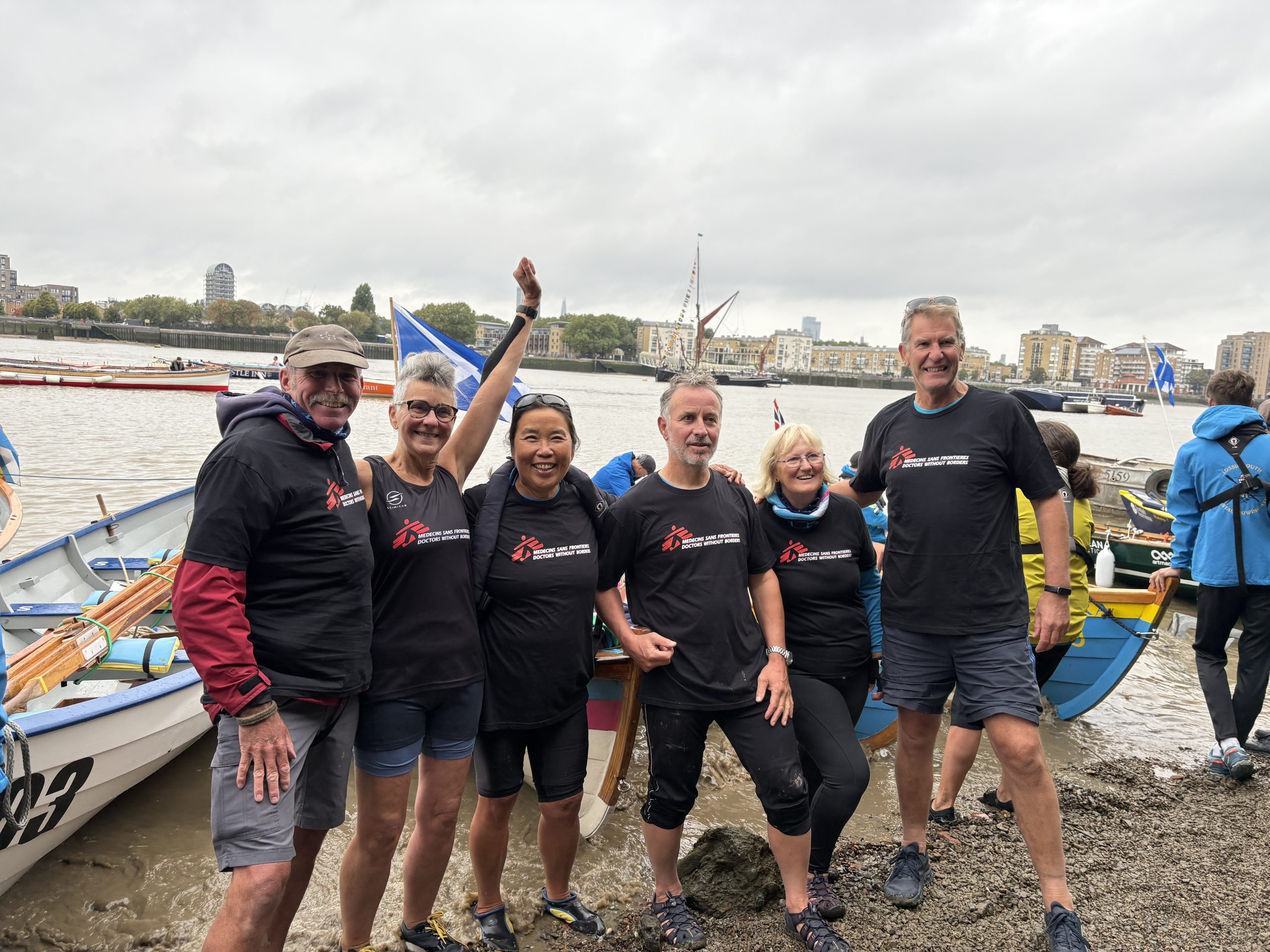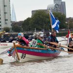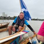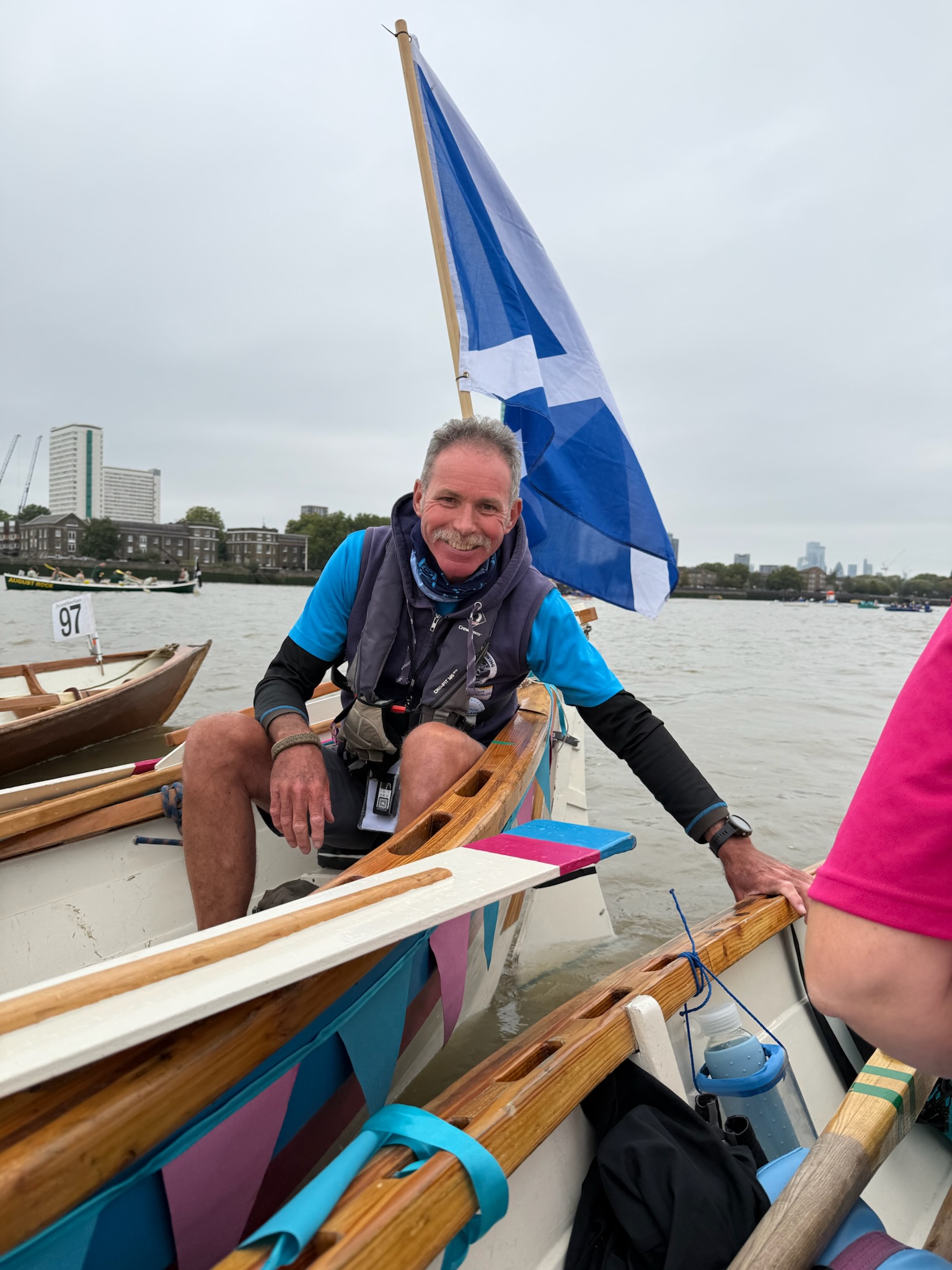 Moving swiftly forward, our Wormit warriors did indeed progressively regroup, ultimately finding themselves plus two skiffs riverside in Millwall, The Flying Boat already afloat having been safely rafted upriver from Richmond. As the start time approached, boats were rigged and decorated; Wormit’s skiffs looking resplendent in their colour-coded bunting and with saltires snapping in the surprisingly stiff breeze that had begun to make its presence felt from the west, in sharp contrast from the day before, where back in the Richmond paddock temperatures had reached an unexpected and unseasonal 28C. Once afloat, our crews made their way to the waiting area, coxes threading their boats through a maze of other vessels and finding temporary respite tied to the trailing lines of moored buoys thoughtfully provided for the purpose. At the appointed time, Catalina, coxed by Gabriel and with Heather, Jenny, Sam, Nicky and Audrey making up a characteristically fierce Wormit women’s crew, followed closely by The Flying Boat with Dai at the helm and with mixed veterans Gail, Alex, Ruth, Andy and Stuart comprising her seasoned crew, headed for the starting line. At 1049 hrs sharp (GMT, of course), with hands taped, jaws set and loins girded, our Skiffies struck out for Richmond, some three hours and 21.6 miles distant.