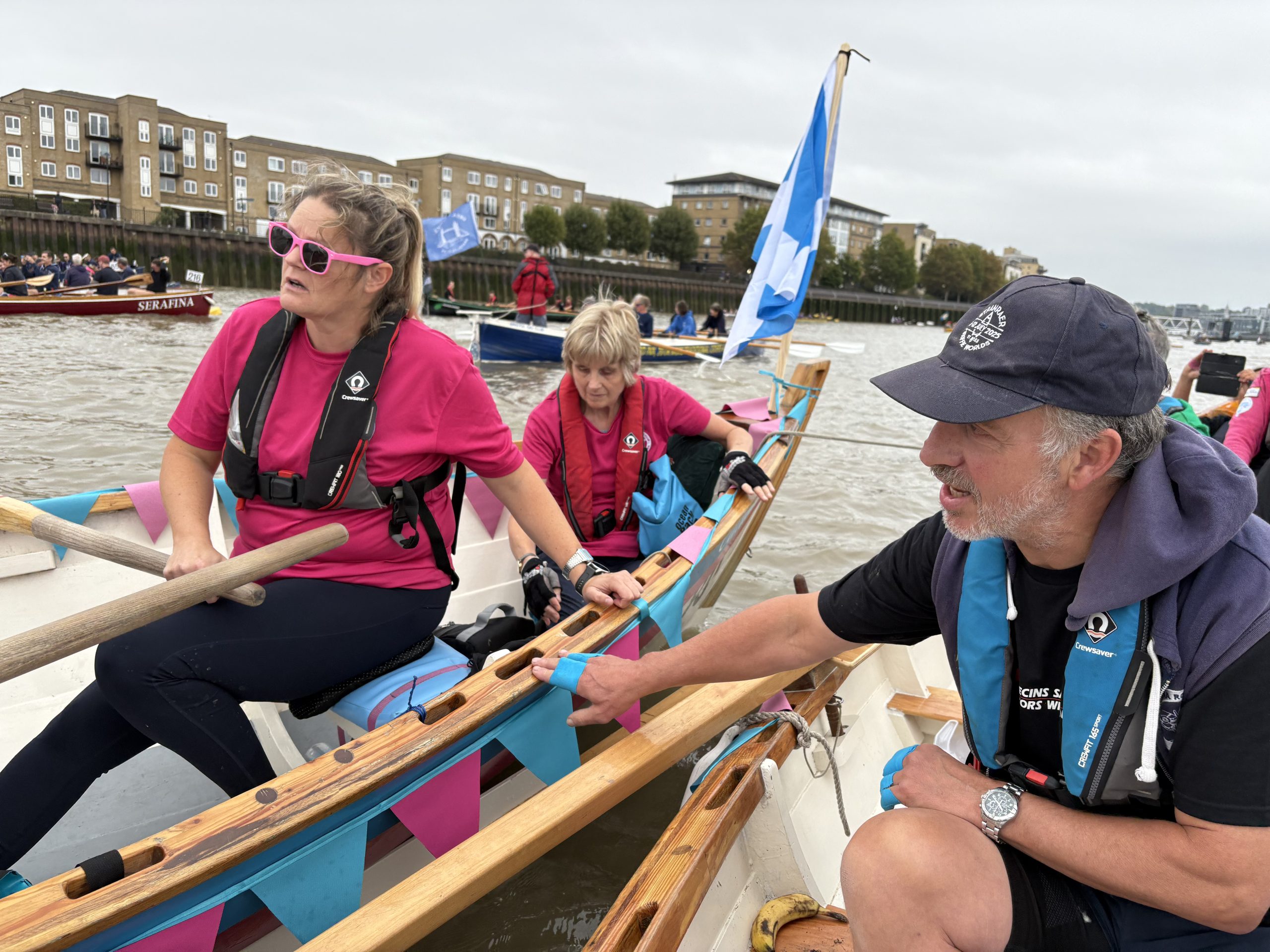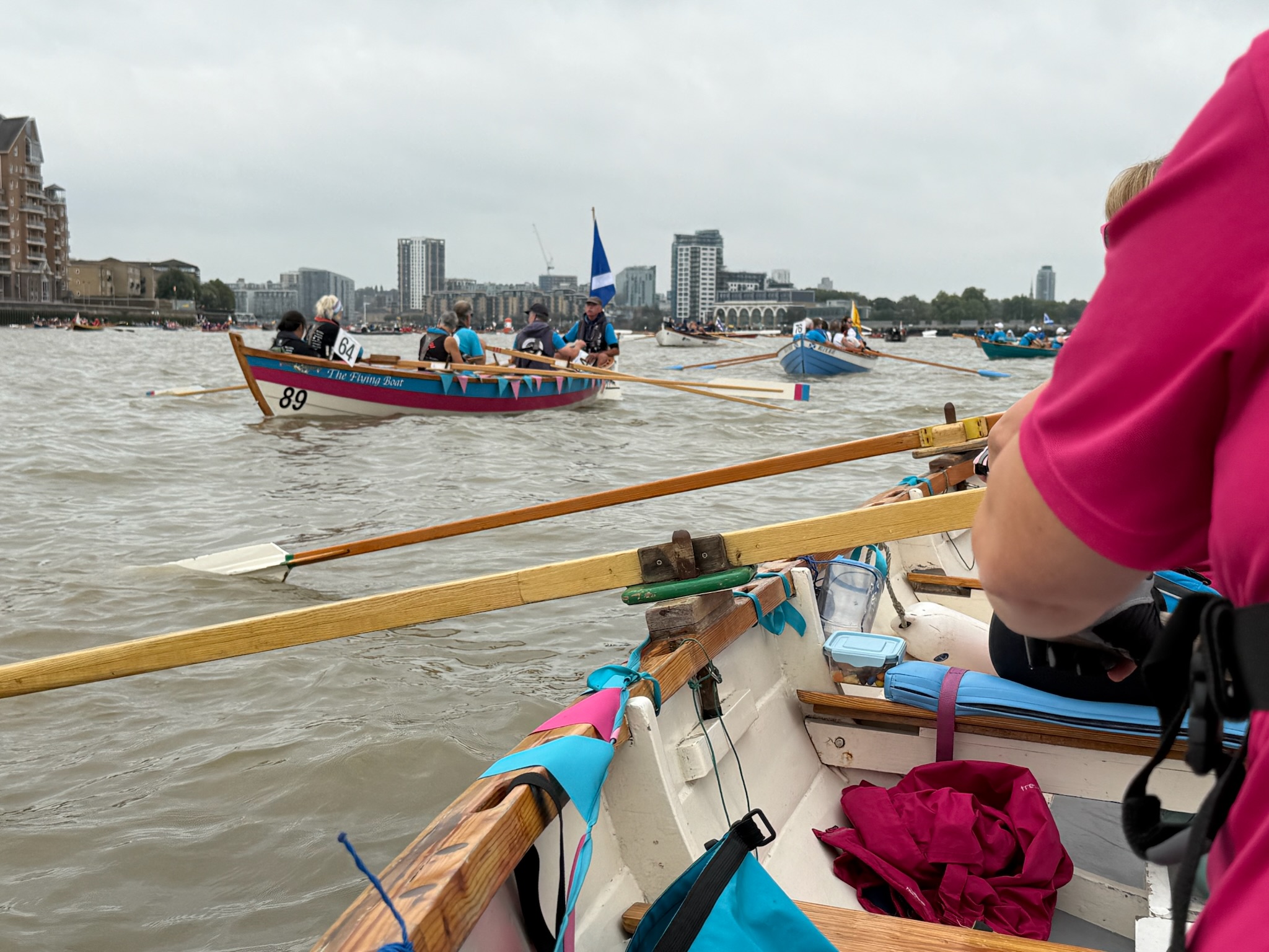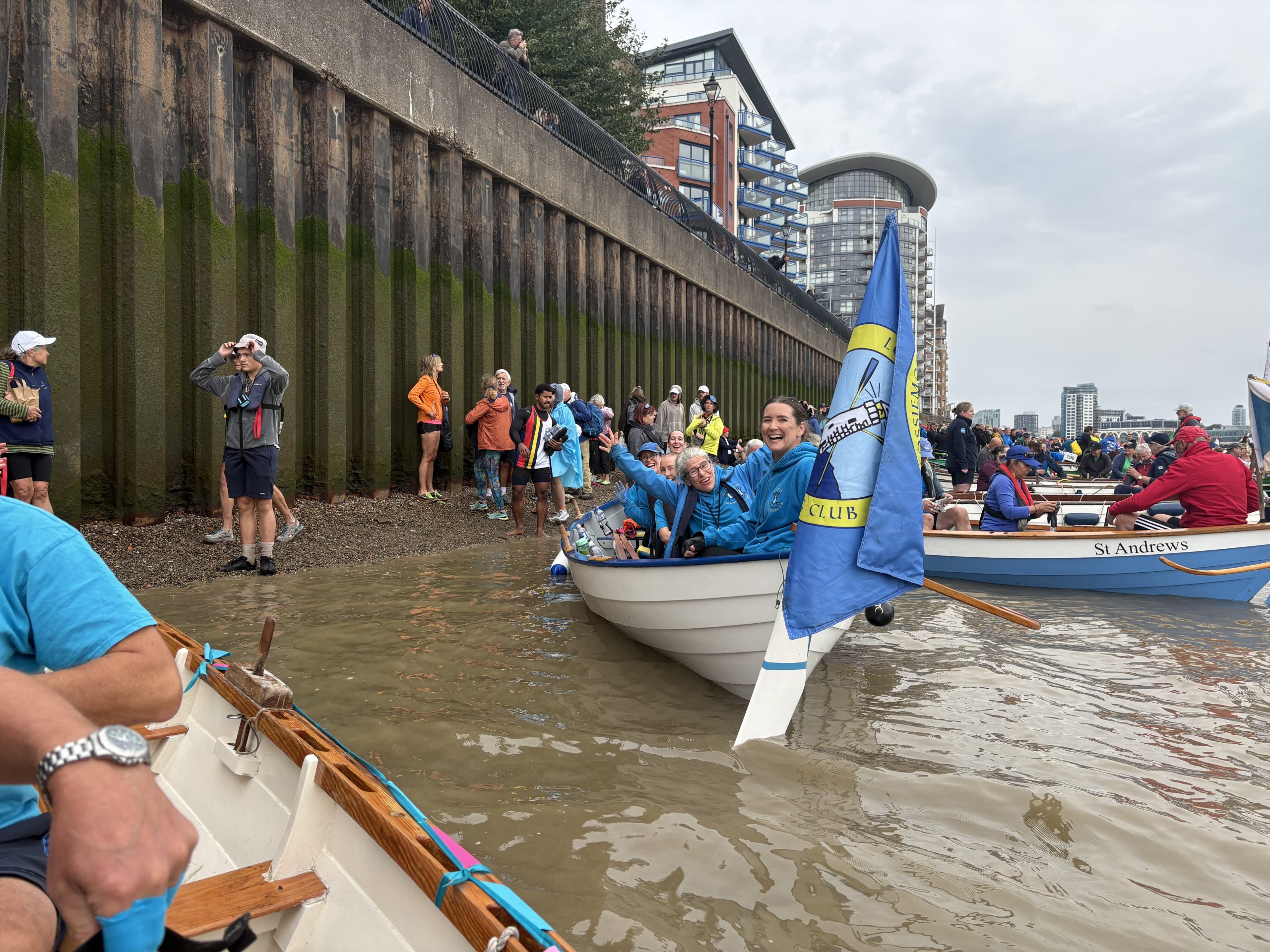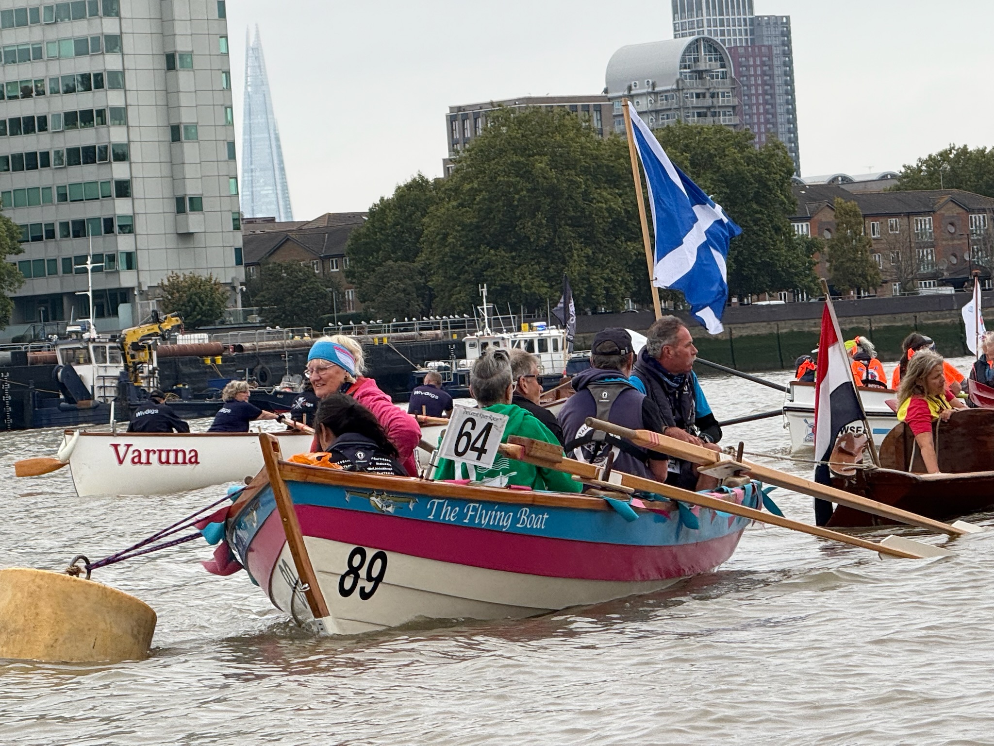 Moving swiftly forward, our Wormit warriors did indeed progressively regroup, ultimately finding themselves plus two skiffs riverside in Millwall, The Flying Boat already afloat having been safely rafted upriver from Richmond. As the start time approached, boats were rigged and decorated; Wormit’s skiffs looking resplendent in their colour-coded bunting and with saltires snapping in the surprisingly stiff breeze that had begun to make its presence felt from the west, in sharp contrast from the day before, where back in the Richmond paddock temperatures had reached an unexpected and unseasonal 28C.  Once afloat, our crews made their way to the waiting area, coxes threading their boats through a maze of other vessels and finding temporary respite tied to the trailing lines of moored buoys thoughtfully provided for the purpose.  At the appointed time, Catalina, coxed by Gabriel and with Heather, Jenny, Sam, Nicky and Audrey making up a characteristically fierce Wormit women’s crew, followed closely by The Flying Boat with Dai at the helm and with mixed veterans Gail, Alex, Ruth, Andy and Stuart comprising her seasoned crew, headed for the starting line.  At 1049 hrs sharp (GMT, of course), with hands taped, jaws set and loins girded, our Skiffies struck out for Richmond, some three hours and 21.6 miles distant.