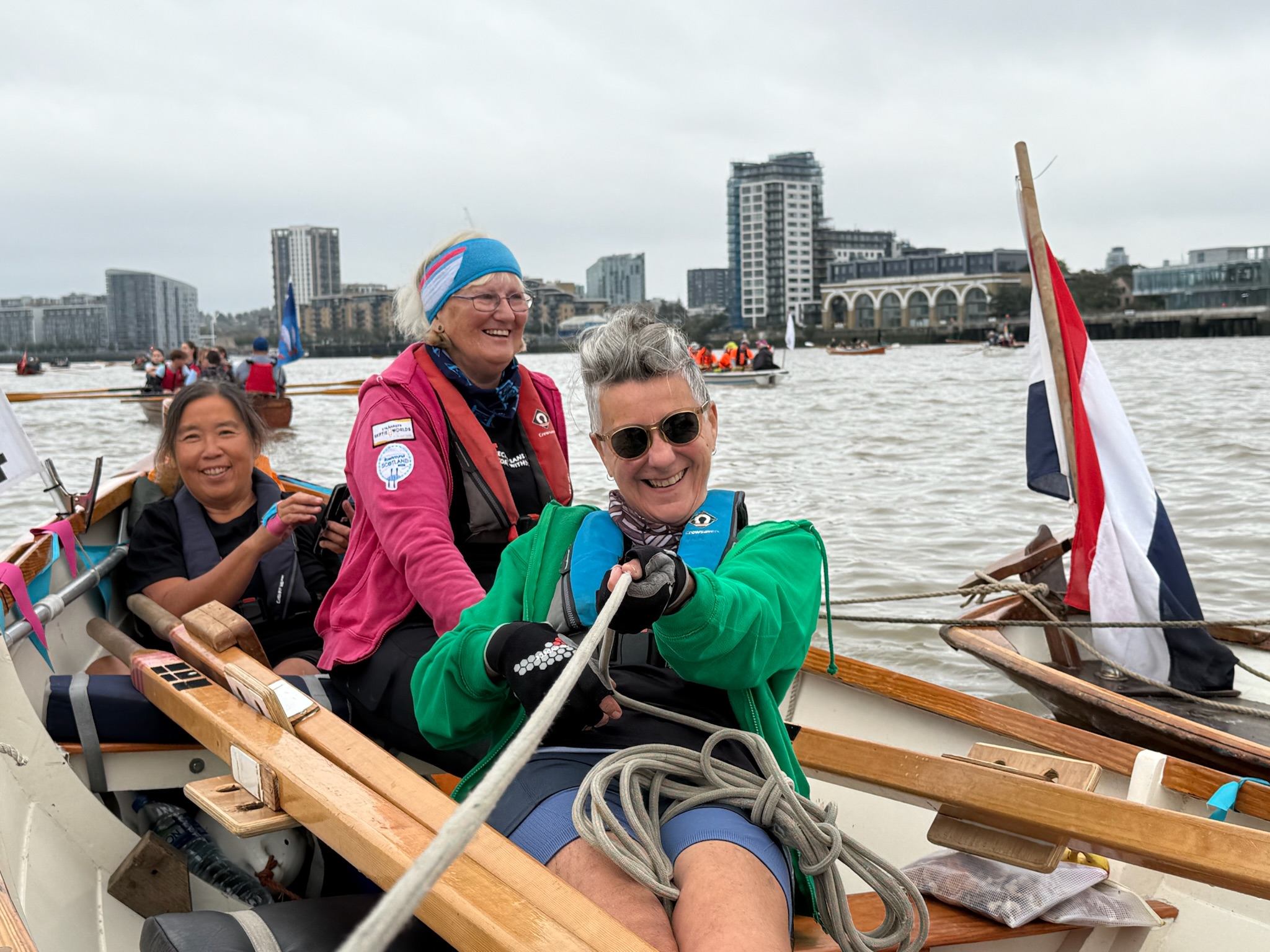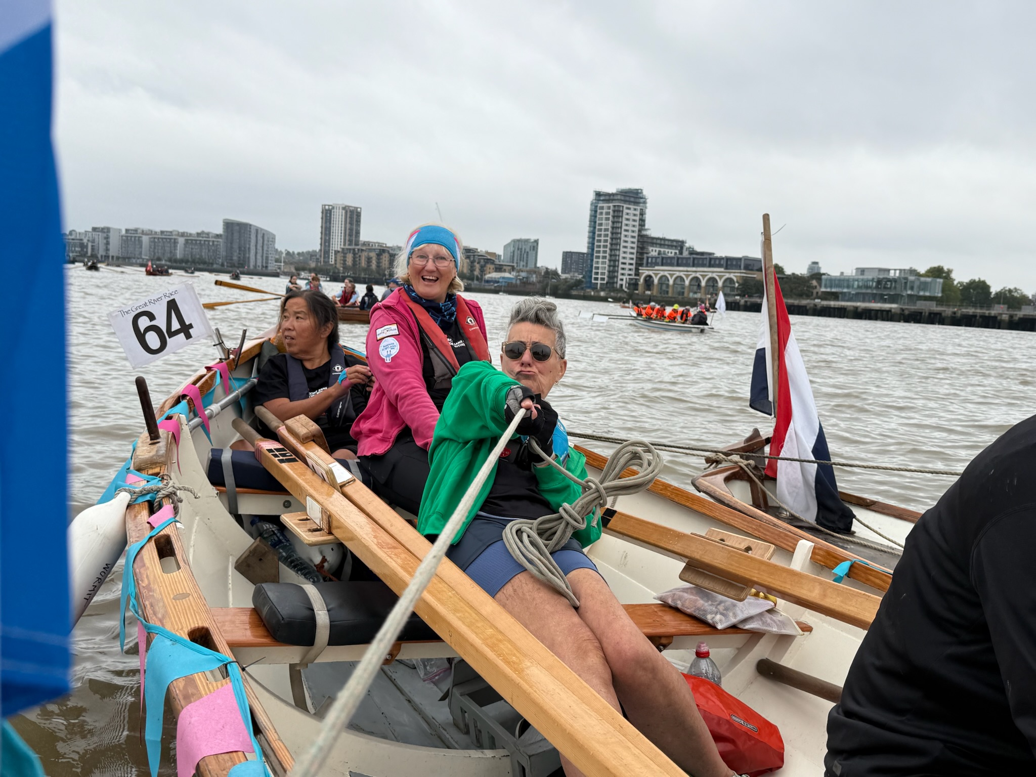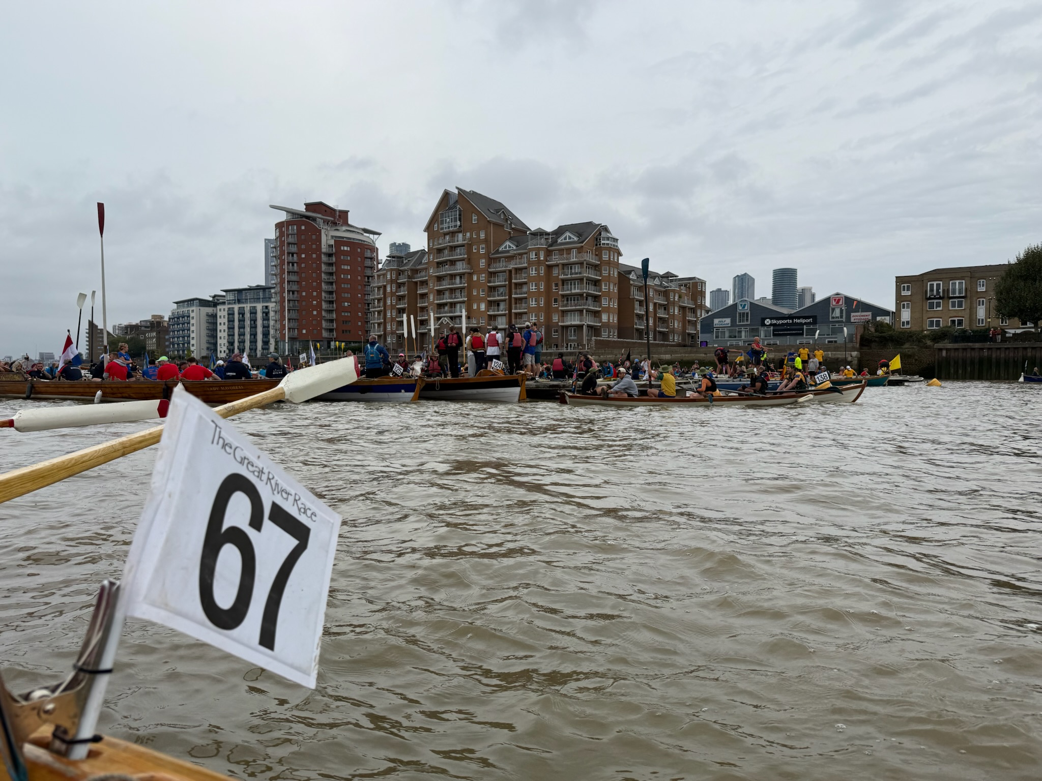 The exact genesis of how this particular event popped into the Club’s programme remains a mystery (Lesley has been mentioned as a possible prime instigator, with Gail as a likely co-conspirator) as, in amongst all the other Club goings-on, The Great River Race became, as it were, a thing.  ‘GRR’ for short is billed as ‘London’s River Marathon’ and is a spectacular, competitive race from Millwall in the east to Richmond in the west, travelling under no fewer than twenty-eight of London’s famous bridges. The race seemingly began back in 1988 with sixty-one boats crewed by a bunch of enthusiasts ranging from young scouts to hardened offshore rowing veterans coming from everything from rowing clubs, pubs, schools, boating societies and the armed forces, since which time it has grown the proverbial arms and legs to become the biggest and most prestigious event of its kind in Europe, with participants competing for 37 trophies. This year, around 300 crews took part, including from the Americas, the Antipodes, many European countries plus of course the Home Nations.