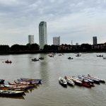 Sometimes in life, reality conspires to confound expectation as, for example, when the menu’s triple-fried artisan rosemary-seasoned potato wedges turn out to be, well, chips. For those in Wormit’s skiffs, surging at full tilt up the Thames in the midst of a vast and colourful flotilla, sinews straining and hearts pounding, sparing no quarter for those around them, for once reality plays ball. And then some. Indeed, were it possible to access the individual inner monologues of our skiffies at this very moment, as they pass into yet another Visit London vista - whether Tower Bridge, the Palace of Westminster, the London Eye, the National Theatre or Battersea power station - the consensus view would likely be ‘Well, THIS is an absolute BLAST!’ All around is a melee of competing boats, jockeying for advantage as the next spectator-bedecked bridge approaches and the available leeway seems to diminish with alarming speed. The gig on Flying Boat’s port beam would appear not to have read the bit in the (dauntingly comprehensive) race rules about ‘no overtaking under bridges’, and up ahead a scout-powered tub has decided to heave-to mid-channel. And all the while the marshals’ powerboats and police launches are charging about demonstrating that, in the hierarchy of the hard-to-herd, rowing boats trump cats every time. It’s like Canaletto’s bustling Grand Canal, only turned up to eleven. And with RIBs. Avoiding numerous inventive-collision opportunities, both Wormit skiffs more than hold their own, Flying Boat’s crew successfully putting into practice their change-over routine with successive coxes keeping things on a mostly even keel. Eventually the tourist landmarks and high rises of central London give way to exclusive riverside apartments, water meadows and the kind of bucolic scenery to warm the heart of Jerome K. Jerome. Or Toad.